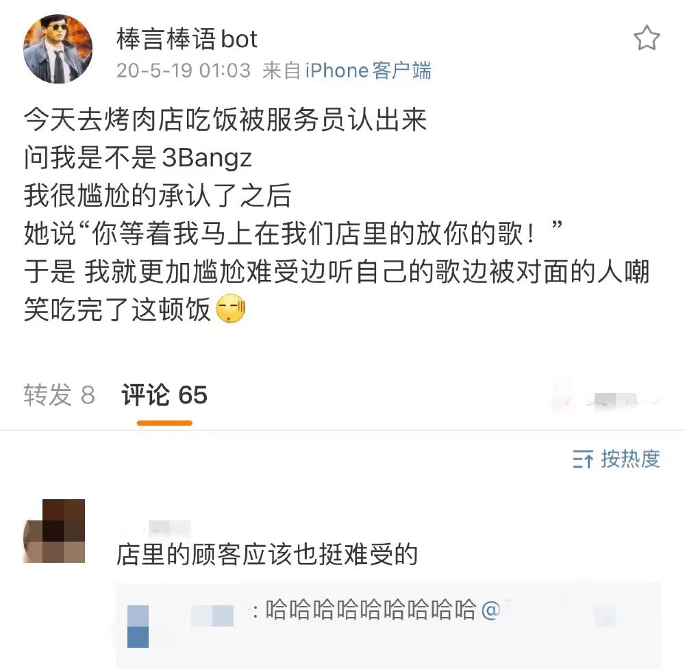 说唱歌手3Bangz也在小号上分享过自己的社死经历:去烤肉店吃饭被服务员认出来,服务员热情放自己的歌却被其他顾客嘲笑,自己只能尴尬吃完这顿饭。骚凹瑞,那场面真是越想越好笑……