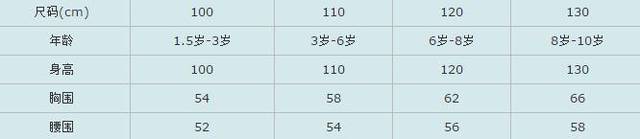 说明:上述提供的计算公式是根据经验得到的数据参数,试用于绝大多数人群,不适用于特殊体型要求。注意:表格中尺码项即为小孩身高,请顾客按照尺码项选择合适的码数,宝贝幼嫩肌肤。