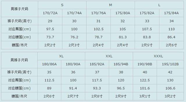 衣服尺码对照表S、M、L、XL、XXL、XXXL男女标准大小尺码
