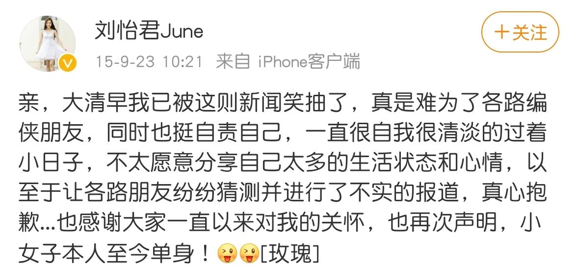 这个说法直到2015年,才经由她本人微博澄清自己一直是单身,否认了作为嫁给富商的传言。