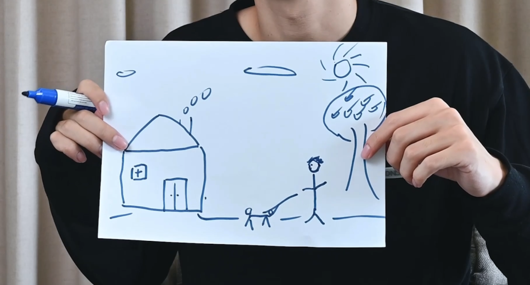 “画中的自己就是一个人嘛,牵着一条狗,其实因为我一直特别喜欢像金毛啊,这种的就是大型犬,然后我就觉得以后如果可以的话特别希望可以就在一个环境特别好的地方,有一个大房子,然后可能有草坪。然后,有一些树啊,可能有一些小湖啊或怎么样的,水啊,然后有一条狗,有个大房子。”