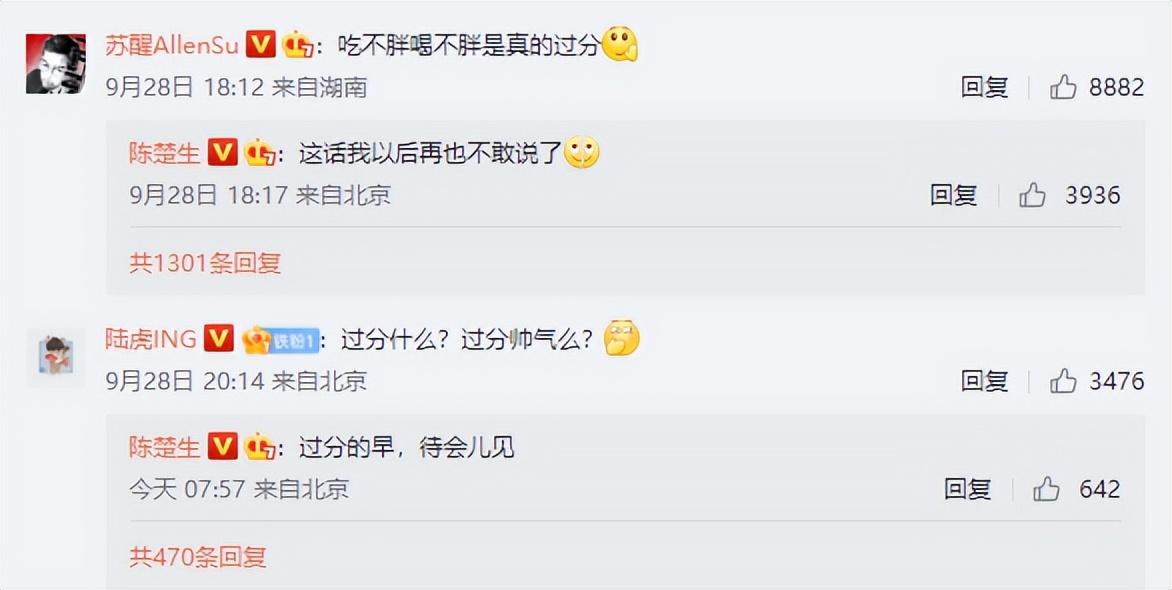 值得关注的是,陈楚生晒出健身照后,除了收到粉丝留言以外,还收到了好兄弟苏醒和陆虎的留言,准确来说是调侃。