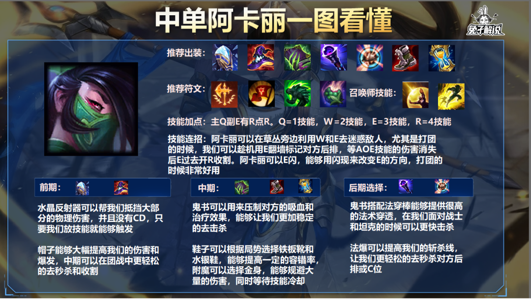 大家好,今天给大家分享一个中单阿卡丽玩法,当版本强势的英雄都遭到削弱的时候,阿卡丽也就显得不那么弱了,所以我们可以重新回到中单位置,并且可以两套出装随意切换。