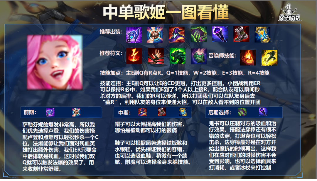 我们的出装可以根据对线的英雄来选择,也可以根据对方阵容来选,如果对方的物理伤害多,我们可以用水晶反射器+铁板靴,如果对面的法伤多,我们可以用时光杖+水银鞋,出装一定要灵活多变,前期有钱可以在第二件或者第三件出一个小鬼书用来压制对方的吸血,如果对方很肉,我们可以后面再升级鬼书,先出法穿棒来提高我们法穿,如果对方脆皮很多,我们也可以先不升级鬼书,先出法爆来收割。鞋子可以根据局势来选择铁板靴和水银鞋,附魔我建议是金身和传送,如果不太会用传送,建议还是出金身去打团。