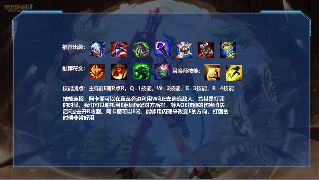 阿卡丽可以在草丛旁边利用W和E去迷惑敌人,尤其是打团的时候,我们可以趁机用E翻墙标记对方后排,等AOE技能的伤害消失后E过去开R收割。阿卡丽可以E闪,能够用闪现来改变E的方向,打团的时候非常好用