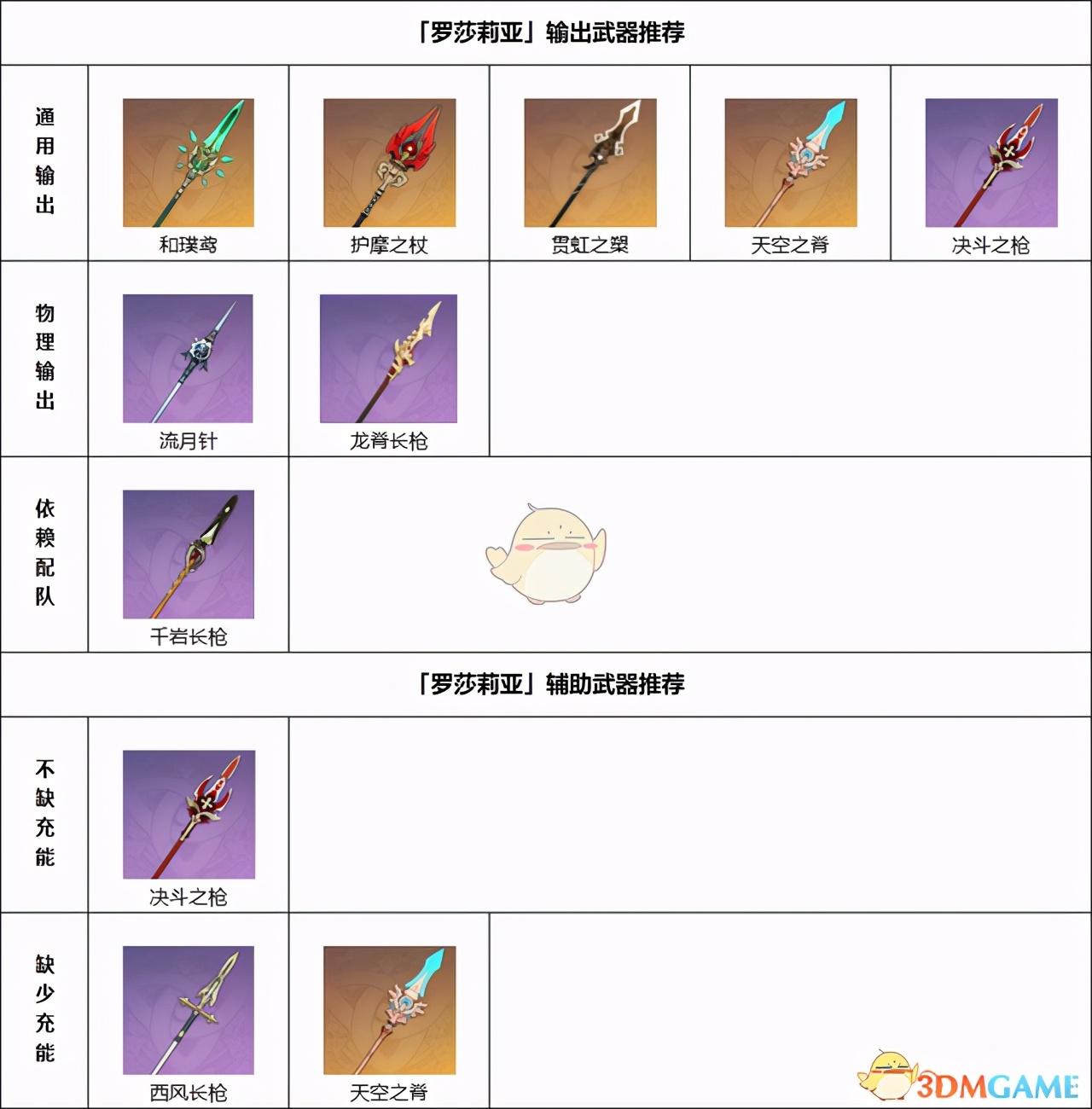 仅作为辅助时,建议根据圣遗物的词缀情况(特别是充能属性,能否保证每**输出循环都有元素爆发技能使用这点至关重要),可以在【西风长枪】、【天空之脊】、【决斗之枪】这些武器中选择。