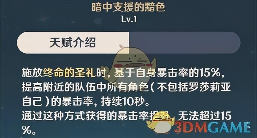 「暗中支援的黯色」是「罗莎莉亚」的固有天赋,由元素爆发「终命的圣礼」触发,效果为释放「终命的圣礼」时基于「罗莎莉亚」属性面板暴击率*15%增加其他队友的暴击率,持续10秒,最高不超过15%。