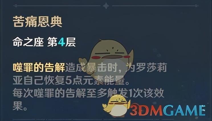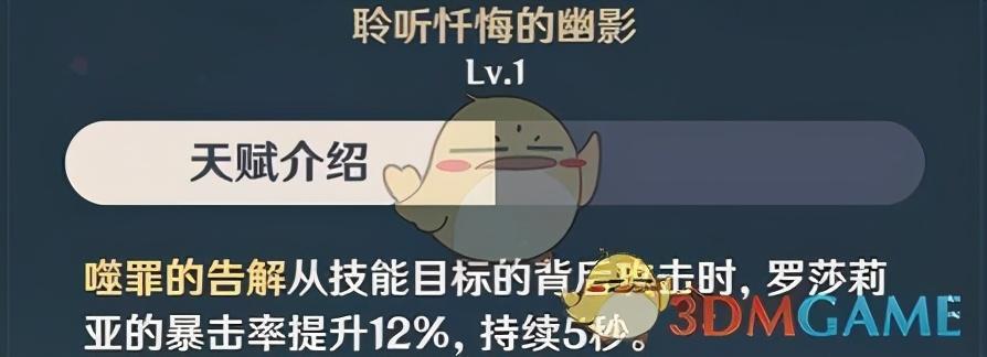 「聆听忏悔的幽影」是「罗莎莉亚」的固有天赋,由元素战技「噬罪的告解」触发,「噬罪的告解」从目标的背后命中后提升「罗莎莉亚」12%暴击率,持续5秒。