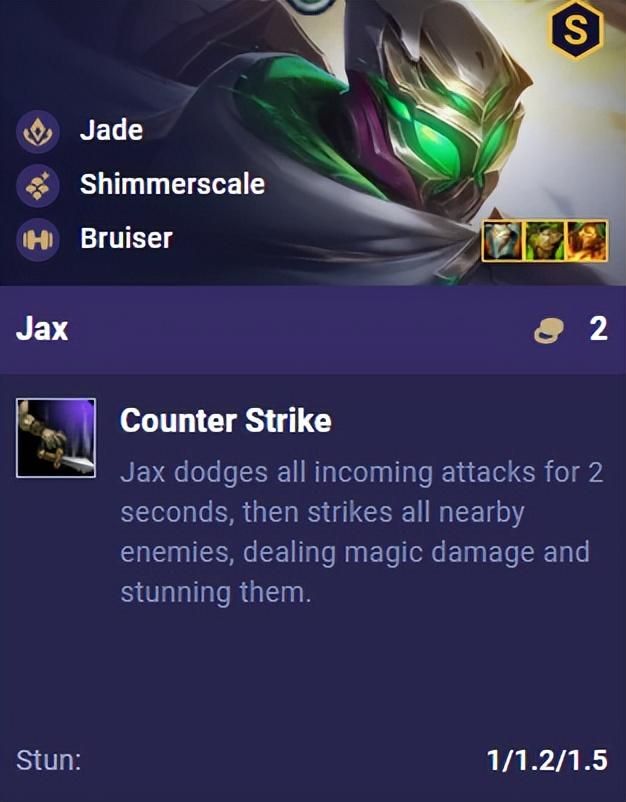 技能:贾克斯进入反击风暴,期间免疫所有伤害持续2秒,结束后对周围敌军造成225/325/450ap魔法伤害并眩晕他们1/1.2/1.5秒。