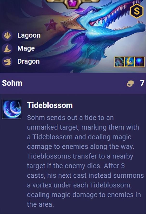 技能:Sohm向一个没有被标记的目标发射一道潮汐,用潮汐之花(暂译)标记他们,对沿途敌人造成150/220/600ap魔法伤害,如果被标记的目标死亡,潮汐之花会转移到附近的目标身上,三次施法后,Sohm的下一次技能将改为对所有潮汐之花范围内的所有敌人造成300/450/1500ap的魔法伤害。