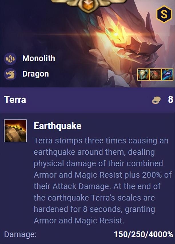 技能:Terra跺脚三次造成地震,造成1.5/1.6/40.0护甲与魔抗值之和+2.0ad的物理伤害,地震结束后Terra的鳞片将被强化8秒,强化期间获得200/300/50000点护甲和魔抗值。