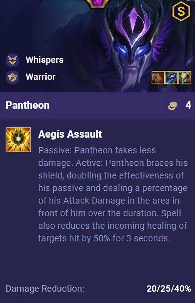 技能:被动:潘森获得20/25/40%伤害减免。主动:潘森举起他的巨盾,使得他的被动效果翻倍,并在持续时间内对他面前的区域共计造成3.0ad+100/150/350ap物理伤害,被攻击的敌人会在三秒内获得50%的减治疗效果。