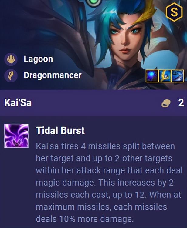 技能:卡莎向目标及其周围的敌人发射四道弹体,每颗造成45/60/80ap点魔法伤害,每次施法会增加两颗弹体,最多达到12颗,当达到最大弹体数后,每颗弹体伤害+10%。