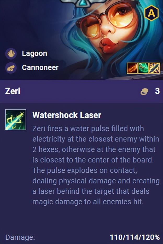 技能:泽丽朝着2格范围内最近的敌方目标(如果没有则朝棋盘最中央的敌方目标)发射一道带电水脉冲,脉冲对接触到的第一个敌军造成1.1/1.14/1.2ad物理伤害,并在其身后生成一道激光,对被击中的所有敌人造成200/300/600ap的魔法伤害。