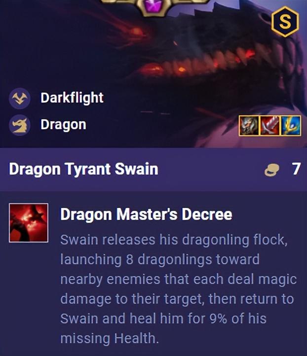 技能:斯维因释放他的龙群,向附近的敌人释放8只龙,每只龙会造成120/180/500ap的魔法伤害,然后返回斯维因恢复他9%的已损生命值。