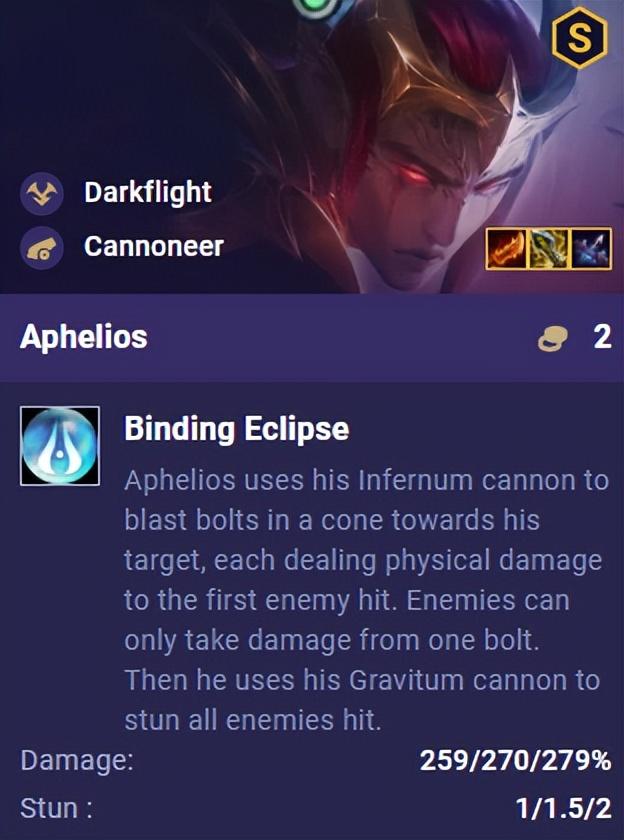 技能:厄斐琉斯向他的目标发射5/5/7颗弹体,每一颗弹体对命中的第一个敌人造成2.59/2.7/2.8ad的物理伤害,对同一个敌人造成的后续伤害会降低80%,然后厄斐琉斯会切换成坠明击晕被击中的全部敌人,眩晕他们1/1.5/2秒。