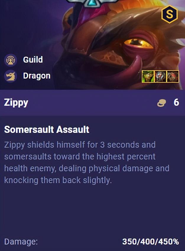 技能:Zippy为自身提供持续2秒的300/400/550ap的护盾,并向血量百分比最高的敌人前翻,造成2.75/3.25/4.0ad的物理伤害并造成击退。
