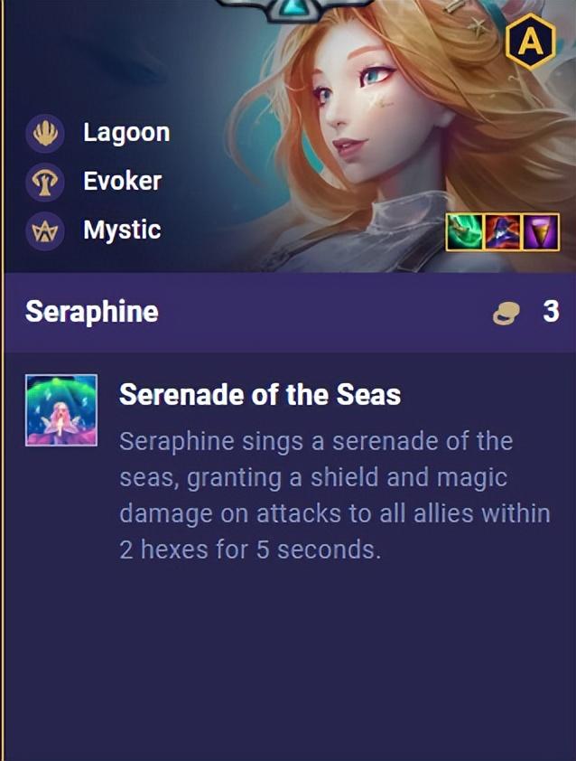 技能:萨勒芬妮吟唱海洋之歌,为两格范围内的友军提供200/275/375ap护盾,并使他们在5秒内每次攻击额外获得2点法力值。