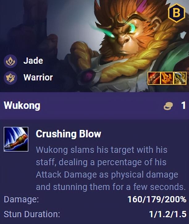 技能:孙悟空用金箍棒重击敌人,造成1.6/1.79/2.0ad+50/75/100ap的物理伤害和1/1.25/1.5秒的眩晕效果。