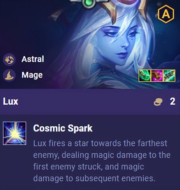 技能:拉克丝向最远的目标发射一道光波,对命中的第一个敌人造成350/550/800ap点魔法伤害,并对后续敌人造成175/275/400ap点魔法伤害。