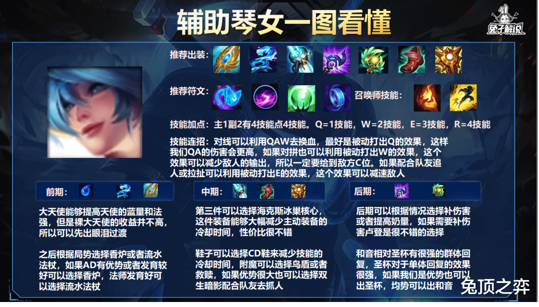 大家好,我是兔子攻略组的大马猴。今天给大家分享一下另一位软辅-琴女,相信大家都非常熟悉了,没错,你琴虽然一直说是弱势英雄,但是经过一些装备的加强,你琴也有了很大的提升,不再是大家认识的那个弱不禁风的琴女了,这个玩法可以说是要奶量有奶量,要控制有奶量,要伤害有伤害了。那么话不多说,我们进入正题。
