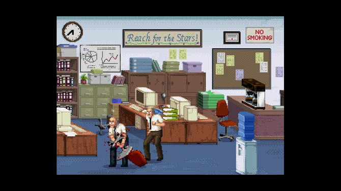 《Rising Up》的故事主角是一位长期饱受职场压抑的中年社畜,某天因为复印机出问题终于压垮了骆驼,怒火勃发,操起办公室的各种道具开始与同事、警察的疯狂战斗之旅。