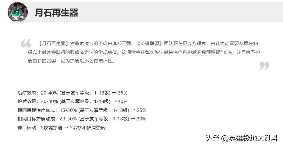 加上13.12版本月石的改动:神话被动改为增加治疗和护盾强度,这让卡尔玛护盾更厚了。