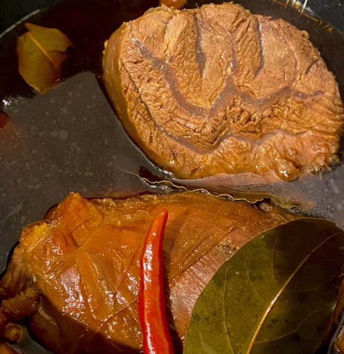 3. 第二天连同酱油一起放入锅中,并加入冷水(水要没过牛腱子肉,多加一点水(熬制过程中水会减少