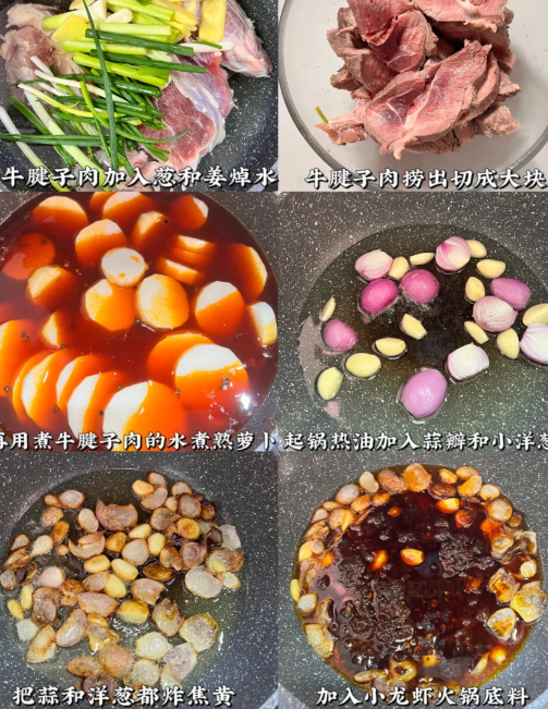 牛腱子肉3斤 小龙虾火锅底料两包 白萝卜 葱姜蒜 蒜苗 花椒 干辣椒 洋葱
