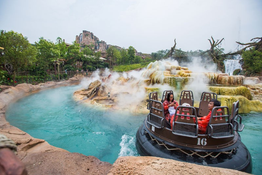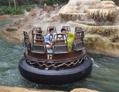 雷鸣山漂流也是可以快速预约的项目,只是我们已经预约了七个小矮人矿山车的项目,所以要规定的时候后才可以预约下个项目。两个通道只能走自由排队的通道,感觉还是自由通道排队的人少一些。等了二十分钟就到了,在排队的围栏中也会布置成船舱,里面许多和船有关的仪器、零配件都会有,让你可以放松一下排队焦急的心情。已经看到漂流所用的船只,底部是用橡胶轮胎围成原型的,减缓碰撞产生的撞击力,可以乘坐八人,出发前会让游客系上安全带。 安排乘坐也非常科学性,都会按2人,单人,多人操作,这样尽可能把大家安排在一个船只里面,合理地减少空置率。