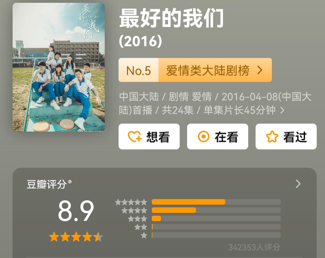 这两部剧的评分也很高,《最好的我们》评分高达8.9,《你好,旧时光》评分8.6。