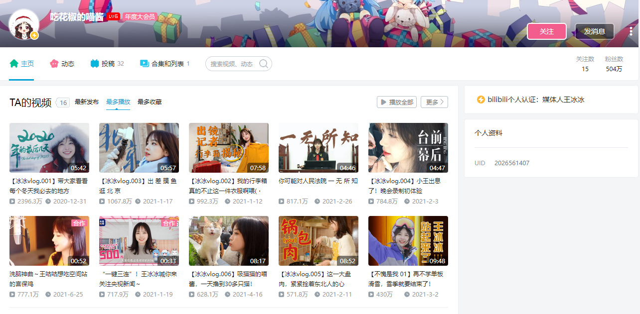 王冰冰顺利走红以后,她的工作方向也发生了变化,除了继续当记者,做本职工作,王冰冰也出现在了各大综艺节目中,她还在视频平台开了自己的账号,粉丝一下子就突破了500万,仅仅一年之间,视频的播放量就已经过亿。