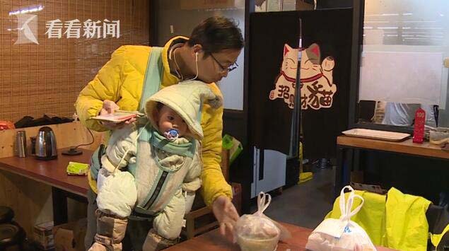 没和记者聊两句,余述江就接到了新订单。为了节省时间,余述江不得不一路小跑,取件送餐,这时他怀中的婴儿会变得非常兴奋,一路上都是手舞足蹈。不过在兴奋之余,孩子红扑扑的小脸似乎也在提醒着记者,为何一个原本应该依偎在母亲身边的婴儿,却要跟着爸爸风雨兼程呢?对此余述江表示他也很无奈。
