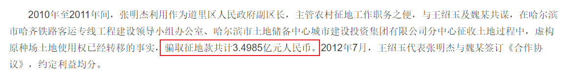 紧接着,2021年11月17日上午,黑龙江省哈尔滨市中级人民法院对哈尔滨市城镇化建设领导小组办公室原主任张明杰受贿、滥用职权,同案被告人王绍玉受贿一案进行公开宣判,以受贿罪判处张明杰无期徒刑,剥夺政治权利终身,并处没收个人全部财产;以滥用职权罪判处张明杰有期徒刑十年,决定执行无期徒刑,剥夺政治权利终身,并处没收个人全部财产。
