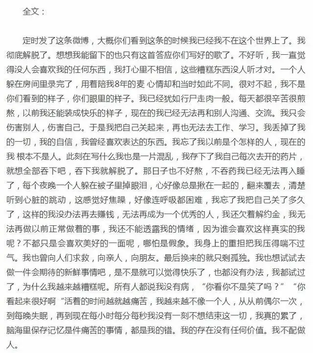 还坦言因为身欠解约金,无法正常做事,身上重担压得自己透不过来气,每日需要靠安眠药助眠,自己曾向亲人朋友求助,但最后换来的也就只有孤独。整个发言是负能量满满。