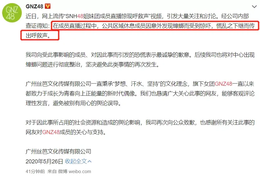 不过,马上GNZ48公司就发文回应直播背景音一事,称是因为成员在公共区域发现了蟑螂所以大声呼救,并不是暴力事件,之后会对蟑螂问题彻底整改。