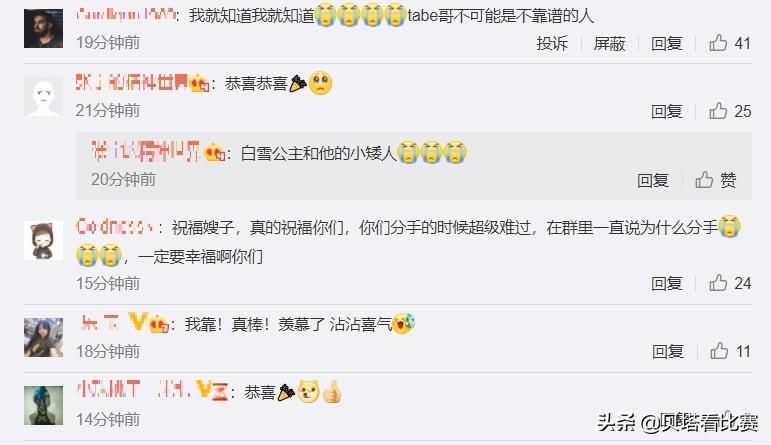在Tabe教练女友宣布结婚的微博下方,很多粉丝也送上了祝福,不少人表示就知道Tabe不可能是不靠谱的人,也有人祝福两人可以白头偕老,一定要一直幸福下去。