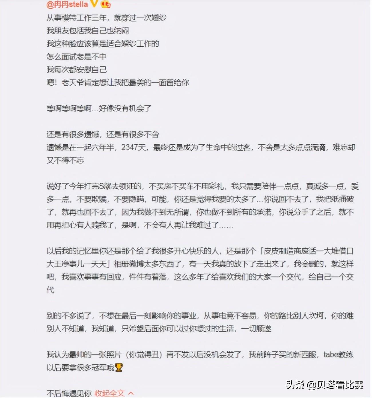 而一个月前,女友的微博如下,当时她表示和Tabe在一起交往6年半后还是分手了,并且表达出了强烈的不舍和爱意,最后还祝福了Tabe未来可以带队拿到更多的冠军,事业发展得越来越好。