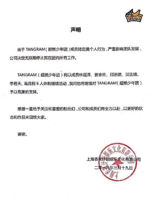 2019年3月19日,香蕉娱乐微博发布声明,表示“由于TANGRAM成员陆定昊个人行为严重影响团队发展,公司决定无限期停止其在团内所有工作。”知情人透露,确实存在私联品牌的行为。