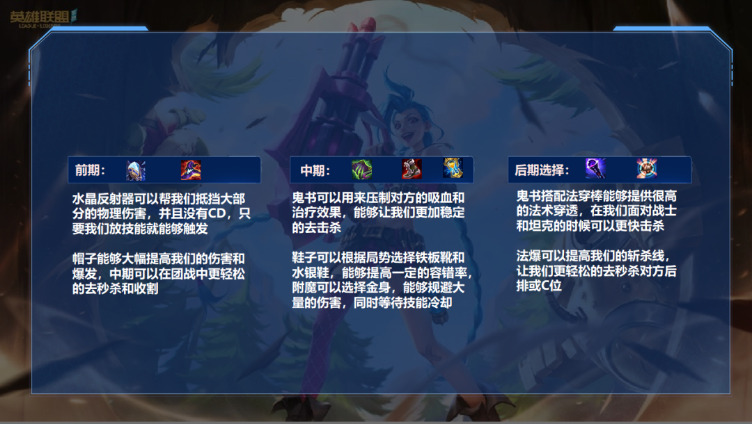 我们的出装可以根据对线的英雄来选择,也可以根据对方阵容来选,如果对方的物理伤害多,我们可以用水晶反射器+铁板靴,如果对面的法伤多,我们可以用时光杖+水银鞋,出装一定要灵活多变,前期有钱可以在第二件或者第三件出一个小鬼书用来压制对方的吸血,如果对方很肉,我们可以后面再升级鬼书,先出法穿棒来提高我们法穿,如果对方脆皮很多,我们也可以先不升级鬼书,先出法爆来收割。鞋子可以根据局势来选择铁板靴和水银鞋,附魔我建议是金身和传送,如果不太会用传送,建议还是出金身去打团。