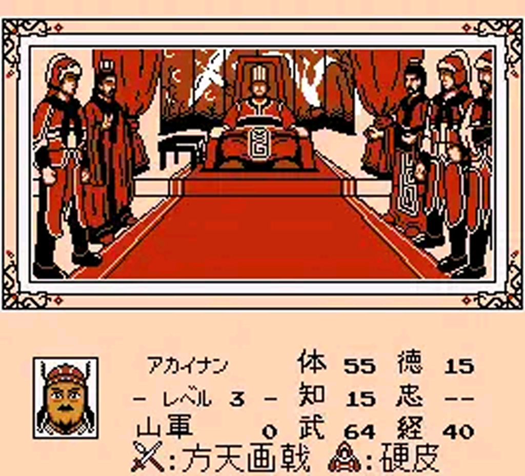 一段时间后,该势力会前往攻打地图上不存在的王甫,这时阿会喃就会出现在战争界面,我们可以用玩家二的手柄操控他。等待粮草用尽后,阿会喃就会撤退。此时,我们可以随意在任何一个城市探索到阿会喃,而且会发现阿会喃仿佛涅槃重生了一般,智力增长到了惊人的255。