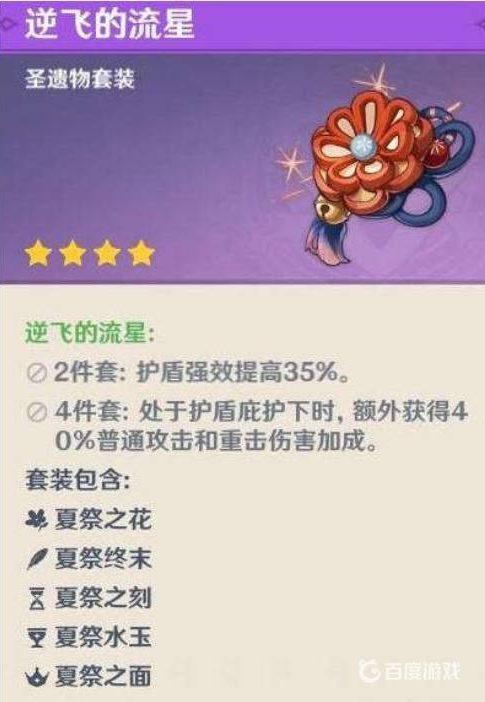 逆飞的流星4件套则是能带来35%的护盾强效加成,以及40%的普攻、重击伤害加成,前提是在护盾庇护下。流星套不建议强行花体力刷,但若有比较好用的圣遗物(比如极品火伤杯),带逆飞4也是不错的,因为胡桃阵容基本是绑定护盾角色的。