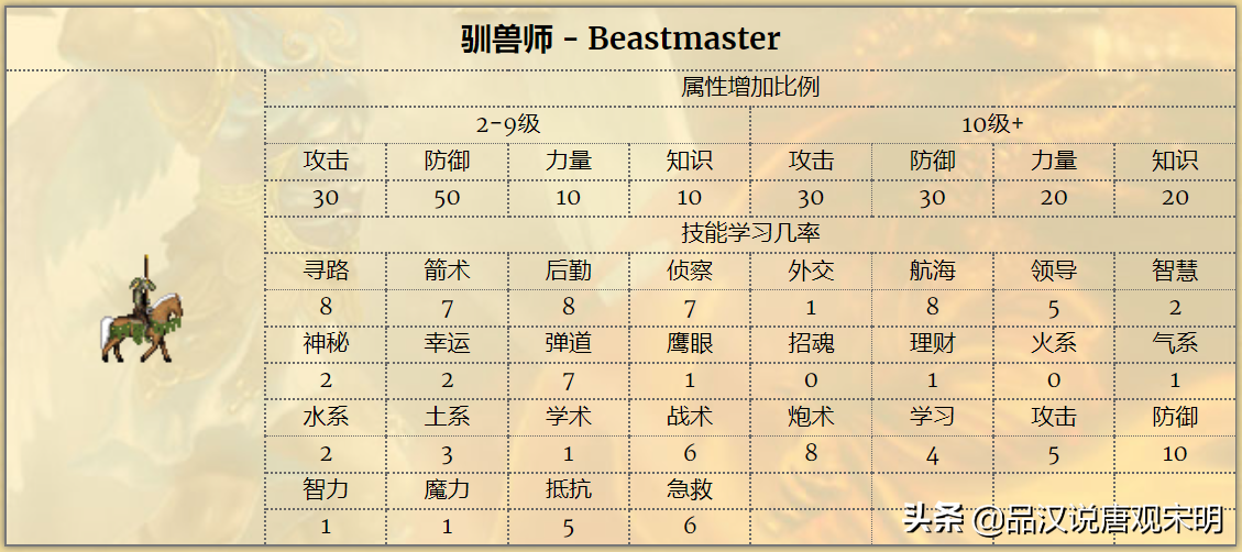 初始属性0411,防御能力提升概率最大,都是驯兽师的特点。而且学不到火系,也是驯兽师的特色之一(难道是因为要塞族在沼泽里?)