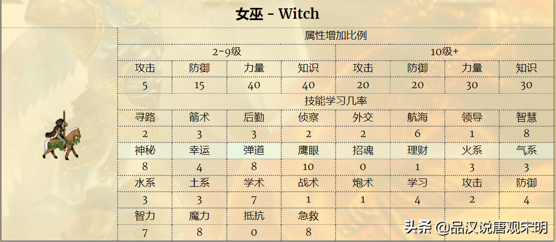 女巫的初始属性0122,比起据点族的法师系战斗法师相比还是要厉害一点。但是要塞族同样无法学习到顶级魔法,所以女巫的职业定位也同样不高。