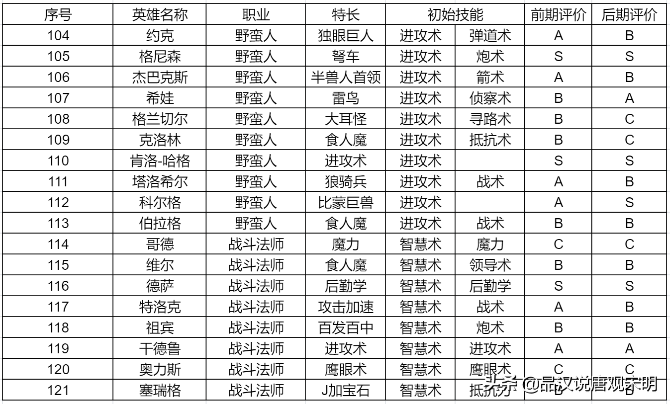 据点族英雄:总计18位,前期A以上9位,后期A以上6位。