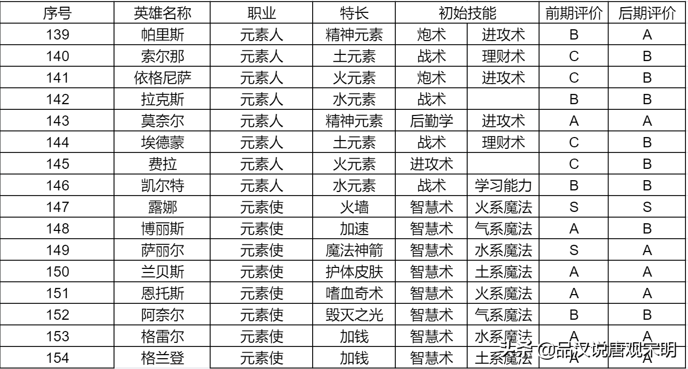 元素族英雄:总计16位,前期A以上8位,后期A以上8位。