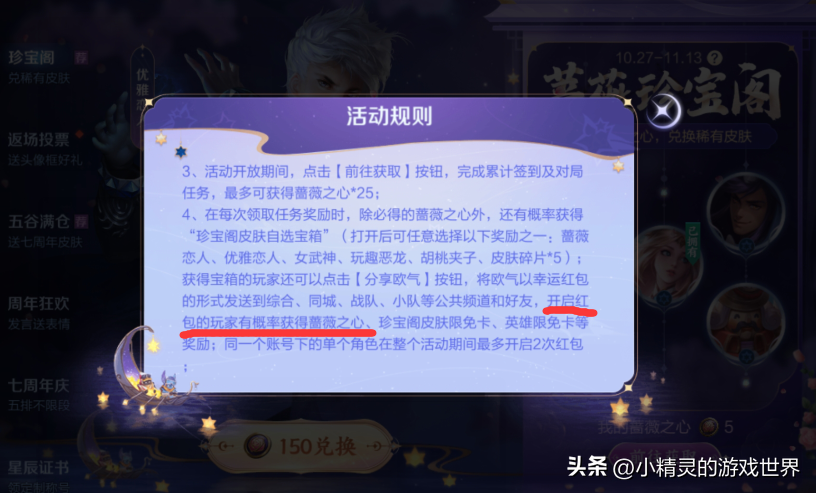 第二个是,每次在领取任务中的蔷薇之心时,都有机会获得“珍宝阁皮肤自选宝箱”,而活动宝箱的玩家,在点击分享欧气之后,会将欧气以红包的形式发送出去,而开启红包的玩家,则有可能获得蔷薇之心,每个玩家在活动期间,最多只能开启两次红包。而在红包中,只有5%的概率获得两个蔷薇之心,其他都是皮肤体验卡,所以在红包中,我们最多可以获得4个蔷薇之心。