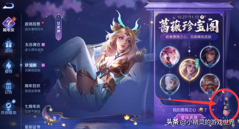 第三个是花藤彩蛋。路径:游戏大厅—活动—周年庆—珍宝阁,然后点击右下角的花藤,这样我们就可以领取到两个蔷薇之心了。