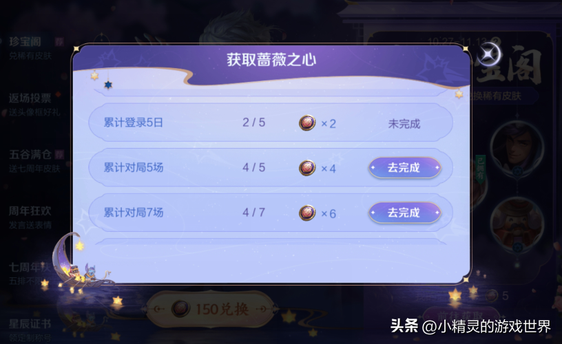 第一个是通过做任务,从27号开始,累计登录,每天都会给两个蔷薇之心,最多累计五天。而累计参与对局,也会给蔷薇之心,累计一局可获得2个蔷薇之心,累计三局可获得3个蔷薇之心,而累计五局可以获得4个蔷薇之心,最高累计7局可获得6个蔷薇之心。所以通过做任务,我们最多可获得25个蔷薇之心。