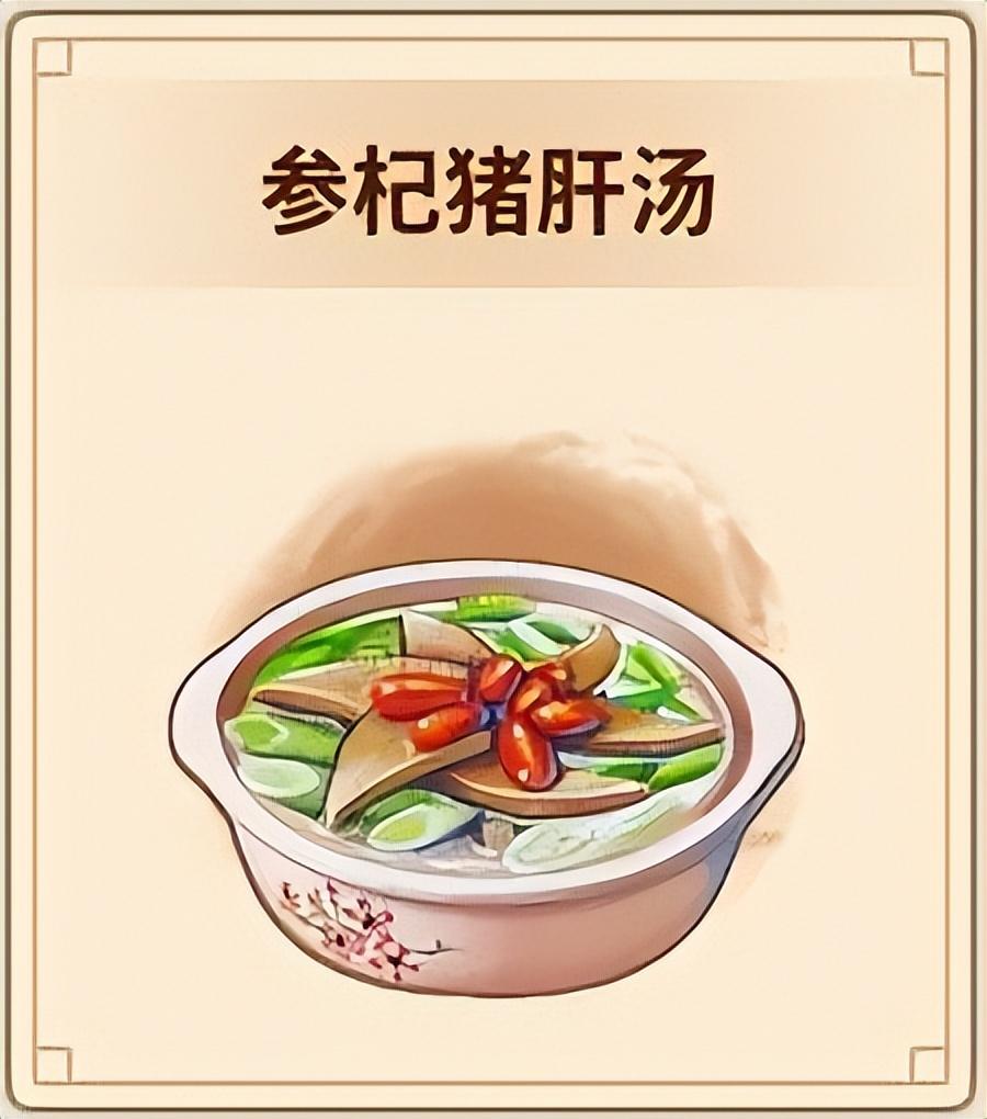 猪肝切片、青蒜切段加入枸杞,人参入鸡汤炖熟。具有补肾益气、健脾养血的功效。